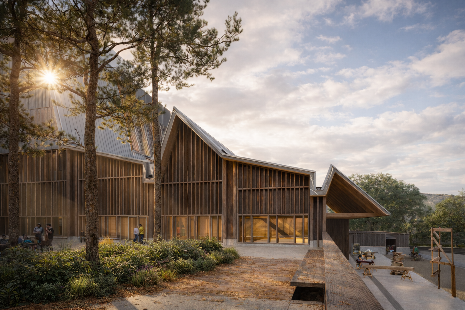 Below, the Work Yard operates as an open-air studio—equal parts fabrication court, delivery zone, and gathering space. Its durable surface of cast-in-place concrete and local gravel grounds the activity of making, while native plantings cascade down from Anthony’s Way, softening the threshold between landscape and architecture. A concealed subsurface vault manages stormwater, slowing runoff and extending the site’s capacity for performance and resilience.