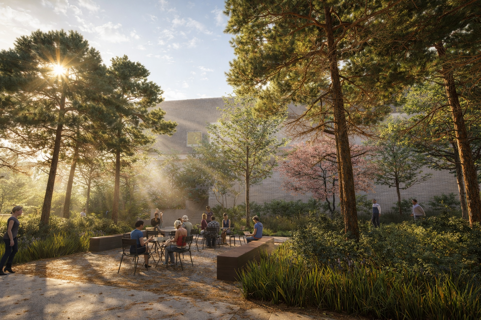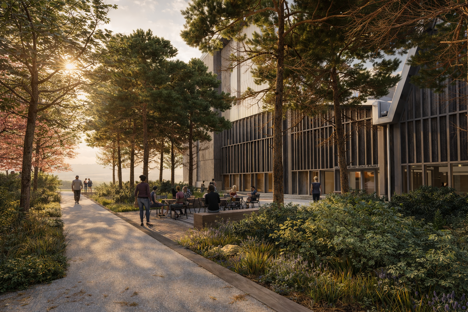 Anthony’s Way unfolds as a living corridor—a processional landscape that draws its character from the Ouachita National Forest, where pine and hardwood weave across uplands and valleys in a rhythm of canopy, understory, and filtered light. This outdoor room is both civic and ecological: a place of gathering, teaching, and repose that translates the forest’s layered structure into a contemporary campus landscape.