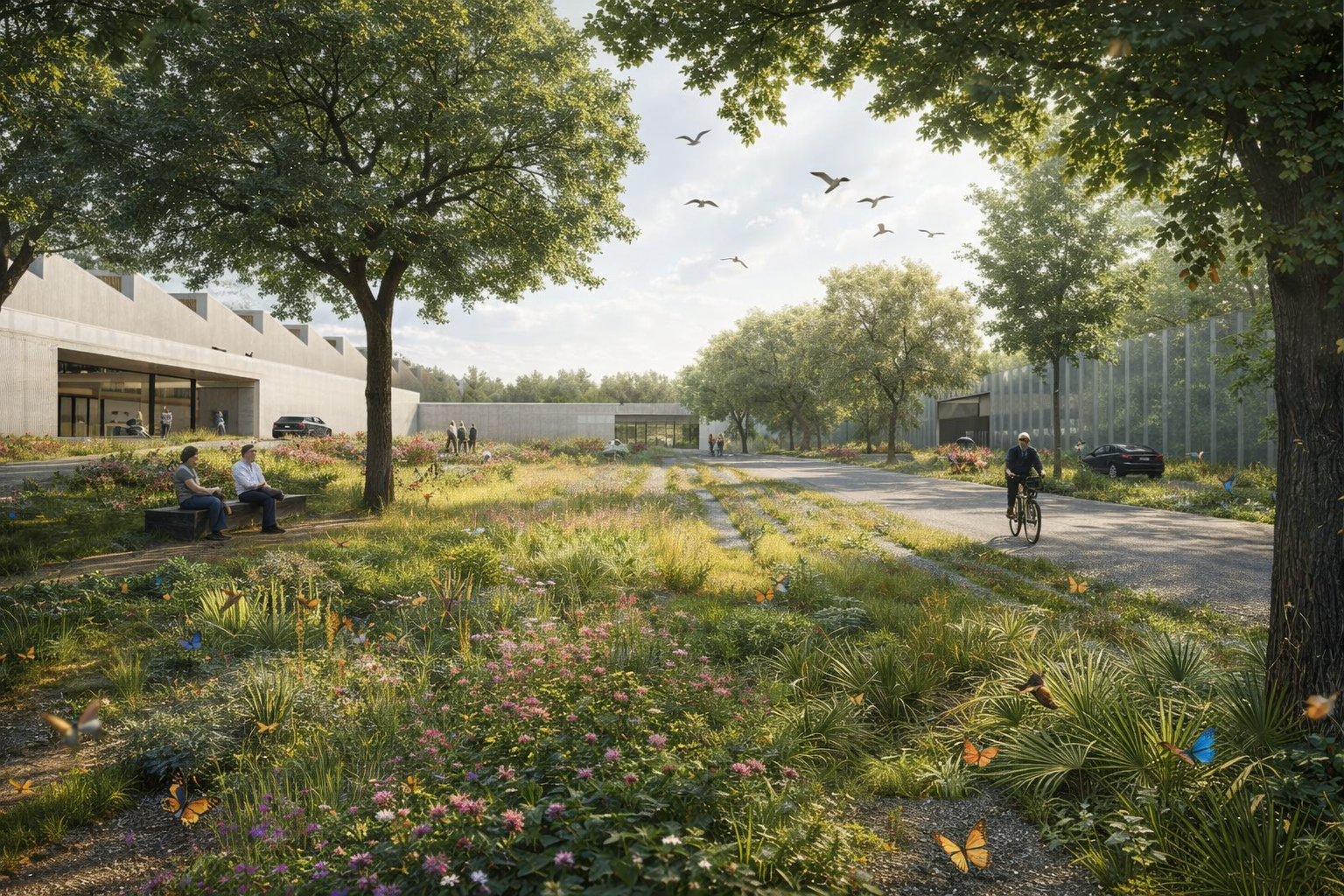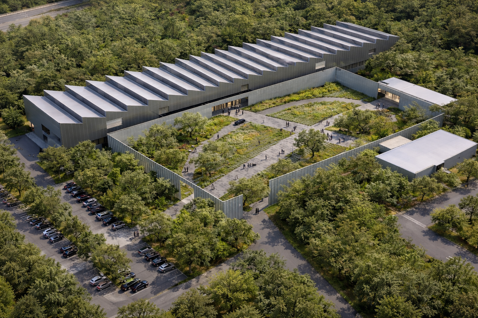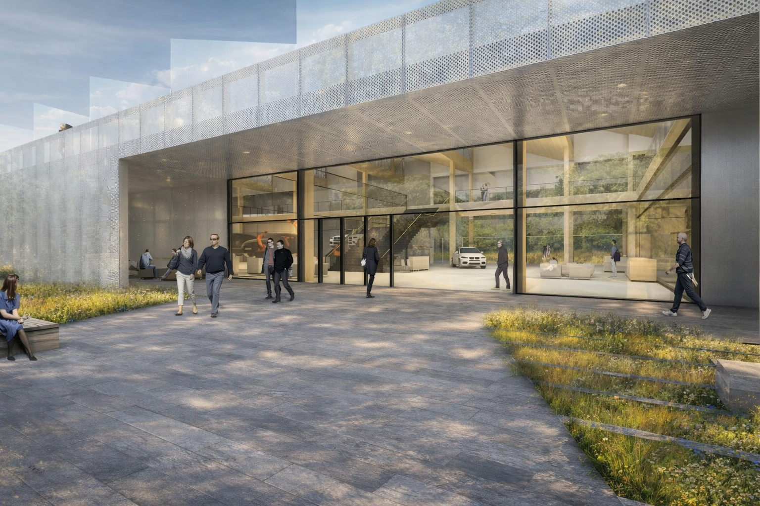 The new arrival to the Plant 10 campus is marked by entry into a large landscape courtyard space – the XHOF – scaled to support public receptions, community events, and gatherings for the full 11,000 employees of the facility. The training center building is designed to minimize its carbon footprint – structured with an engineered wood frame and cross laminated timber panels; naturally daylit; and clad in lightweight recycled perforated aluminum panels. Primary conditioning systems are radiant heating and cooling, and natural ventilation. The building siting and bay spacing is highly flexible, conforming to global BMW standards for space planning and future expansion.