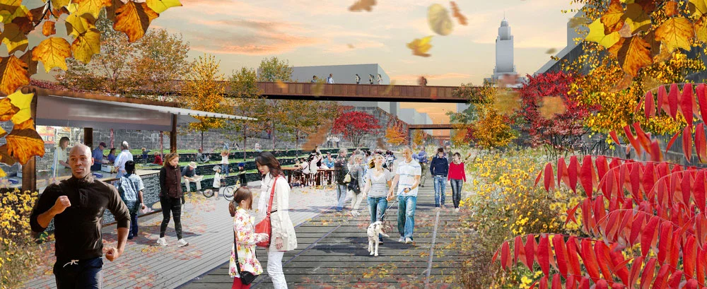 The design’s green infrastructure strategies include increasing the urban forest and pervious surfaces to help divert stormwater from the city’s aged combined sewer system and mitigate runoff pollution while increasing amenity and habitat within the city. This new public amenity will provide passive open space complemented with lush garden greenery, pedestrian and cycling trails, spaces for arts and exhibitions, and create an outdoor classroom for the adjacent Community College of Philadelphia. City Branch offers the unique opportunity to integrate rejuvenating and wild nature into the civic domain.