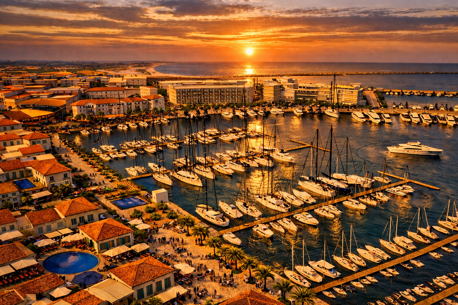 The waterfront promenade extends this civic life along the marina’s edge. Palm-lined walks, informal seating steps, and market terraces create a slow threshold between land and sea — a place to linger, not just pass through. Working slips and leisure berths coexist, allowing fishing craft, sailboats, and visiting yachts to animate the basin throughout the day, reinforcing the authenticity of a harbor that is still in use.