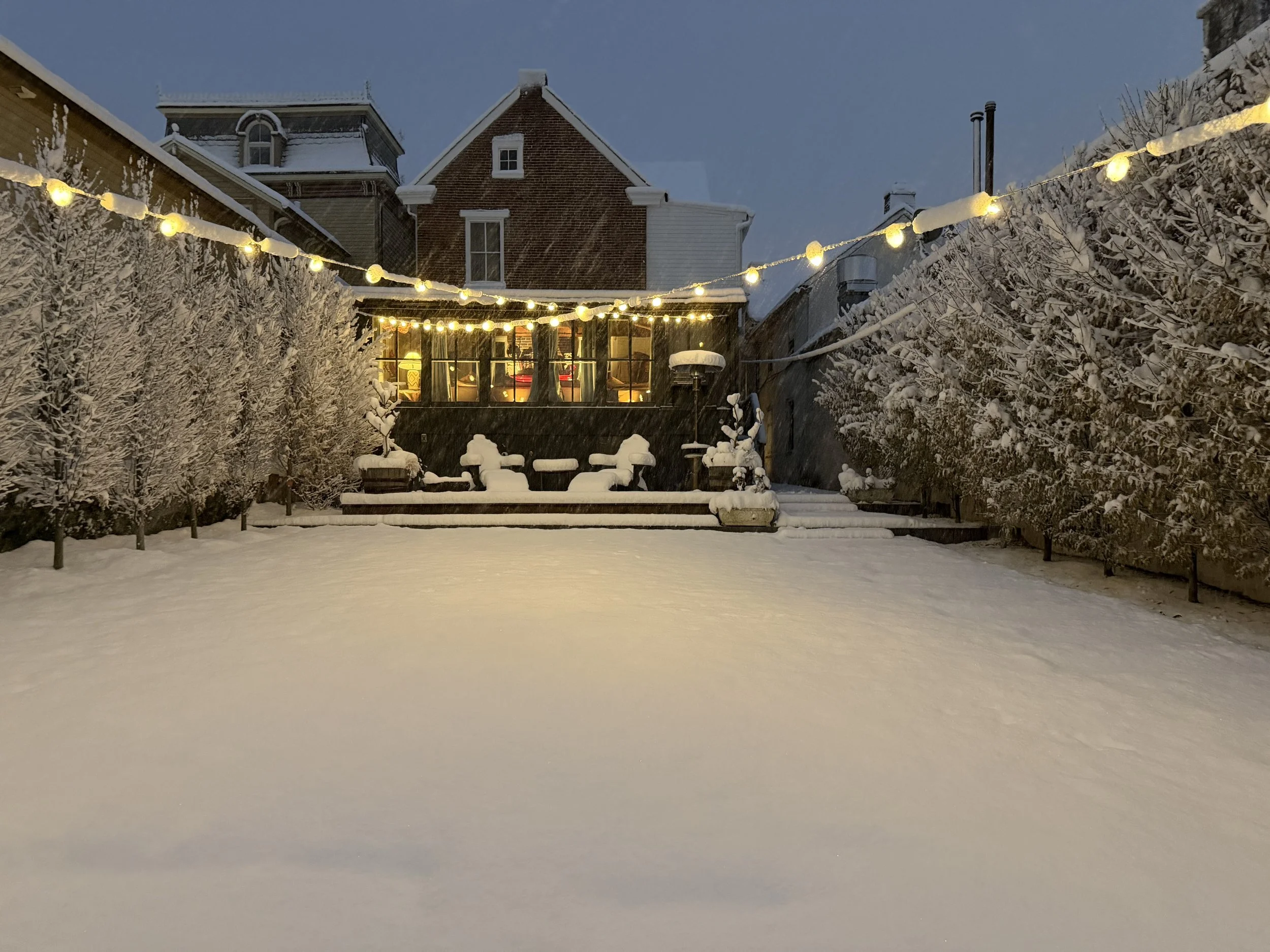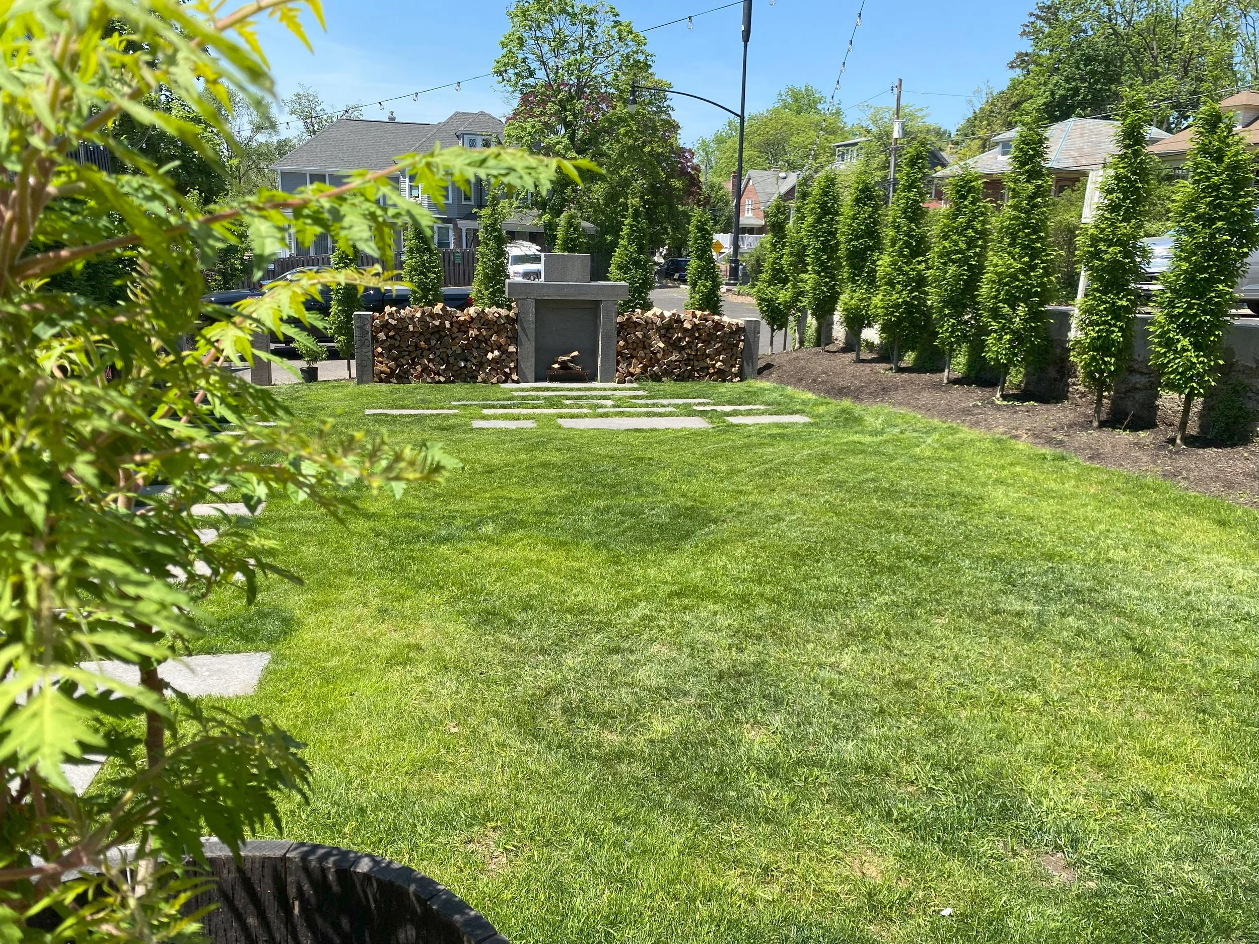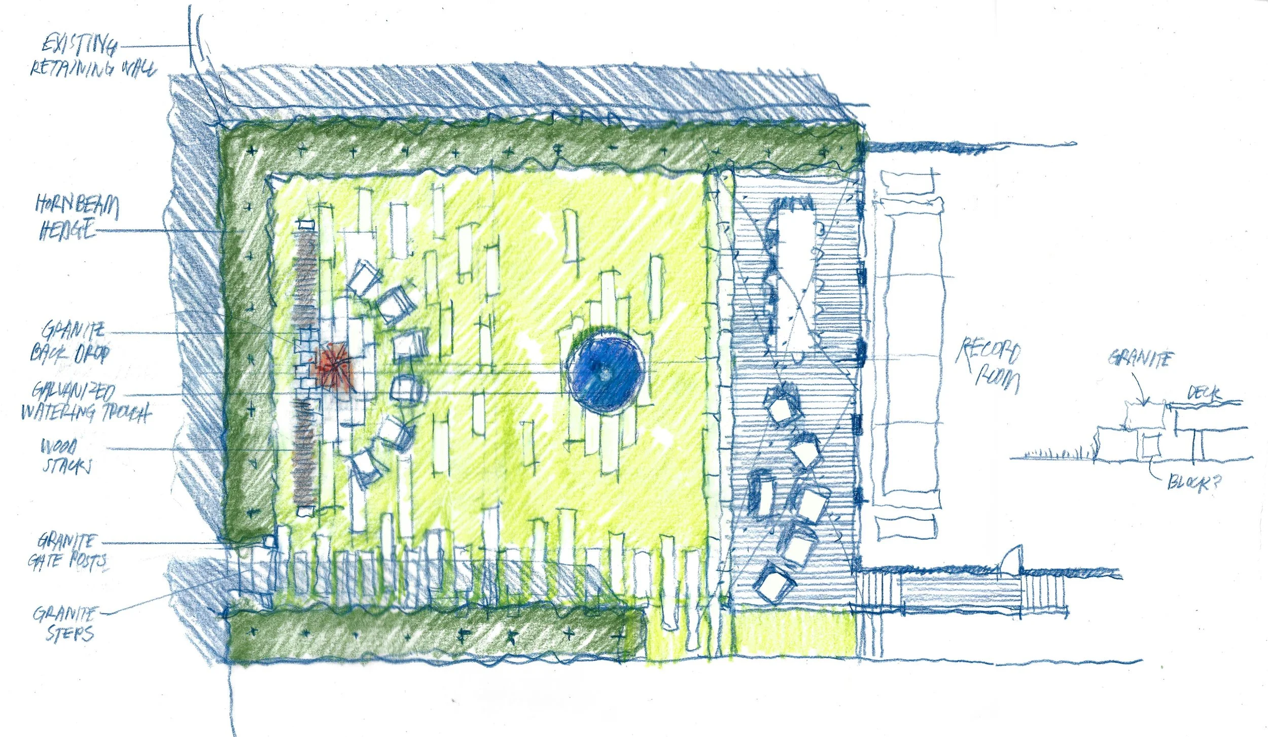 The Green House Garden is a small outdoor room the extends the the outdoor living space of an 1850s colonial home in the heart of Doylestown, Pennsylvania. The plan is centered around a lawn panel, bookended by a performance deck/stage adjacent to the house and a whimsical fireplace on the other. The project utilized reclaimed and naturally sourced materials. The granite cobble paving, stepping stones, outdoor fireplace, steps and seatwalls were reclaimed during the demolition of a pier at Penn’s Landing in Center City Philadelphia. The decking is random width, locally sourced, white oak from Northern Bucks County. Fastigiate Hornbeam enclose the space and are intended to be clipped into a formal hedge.