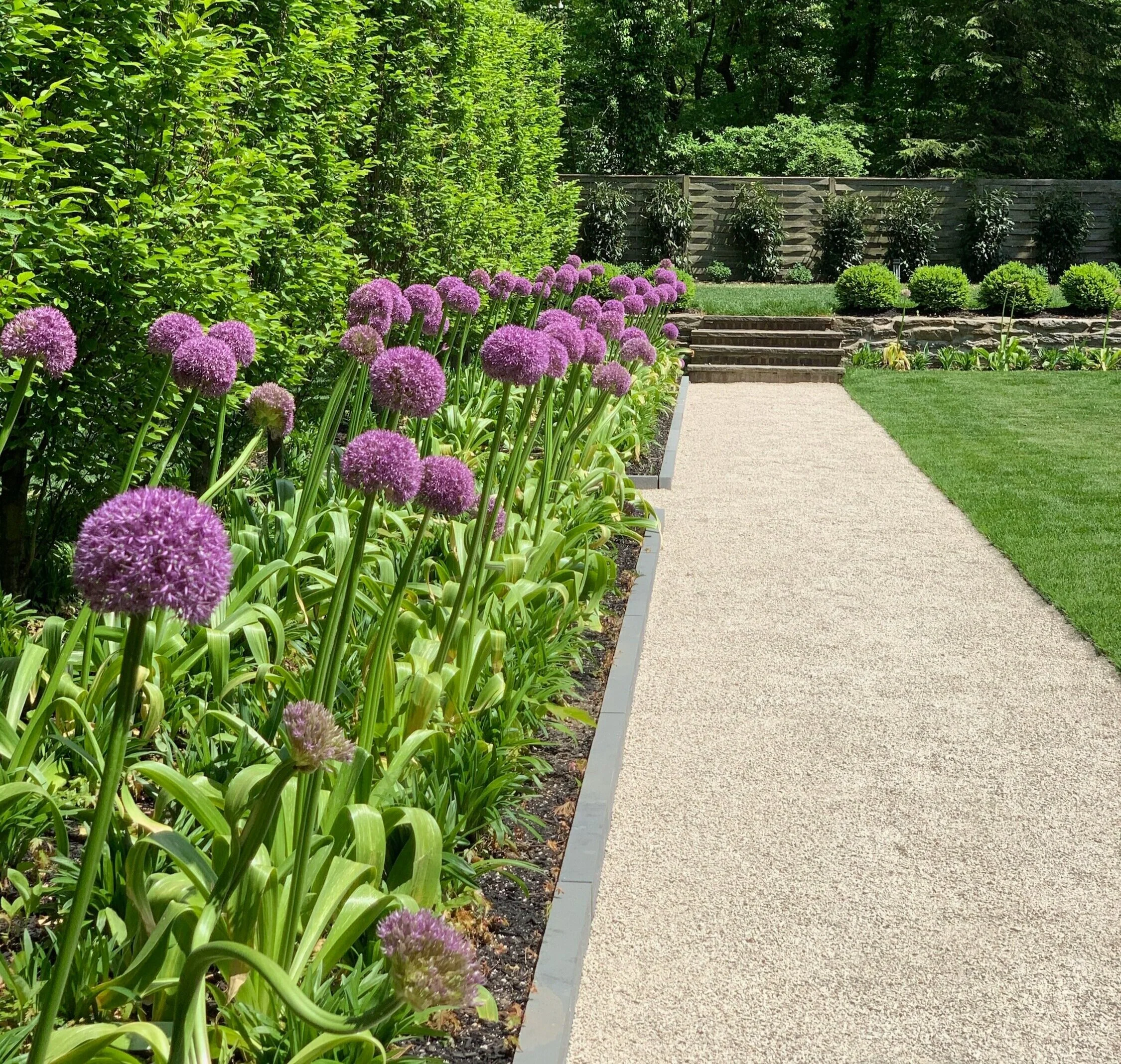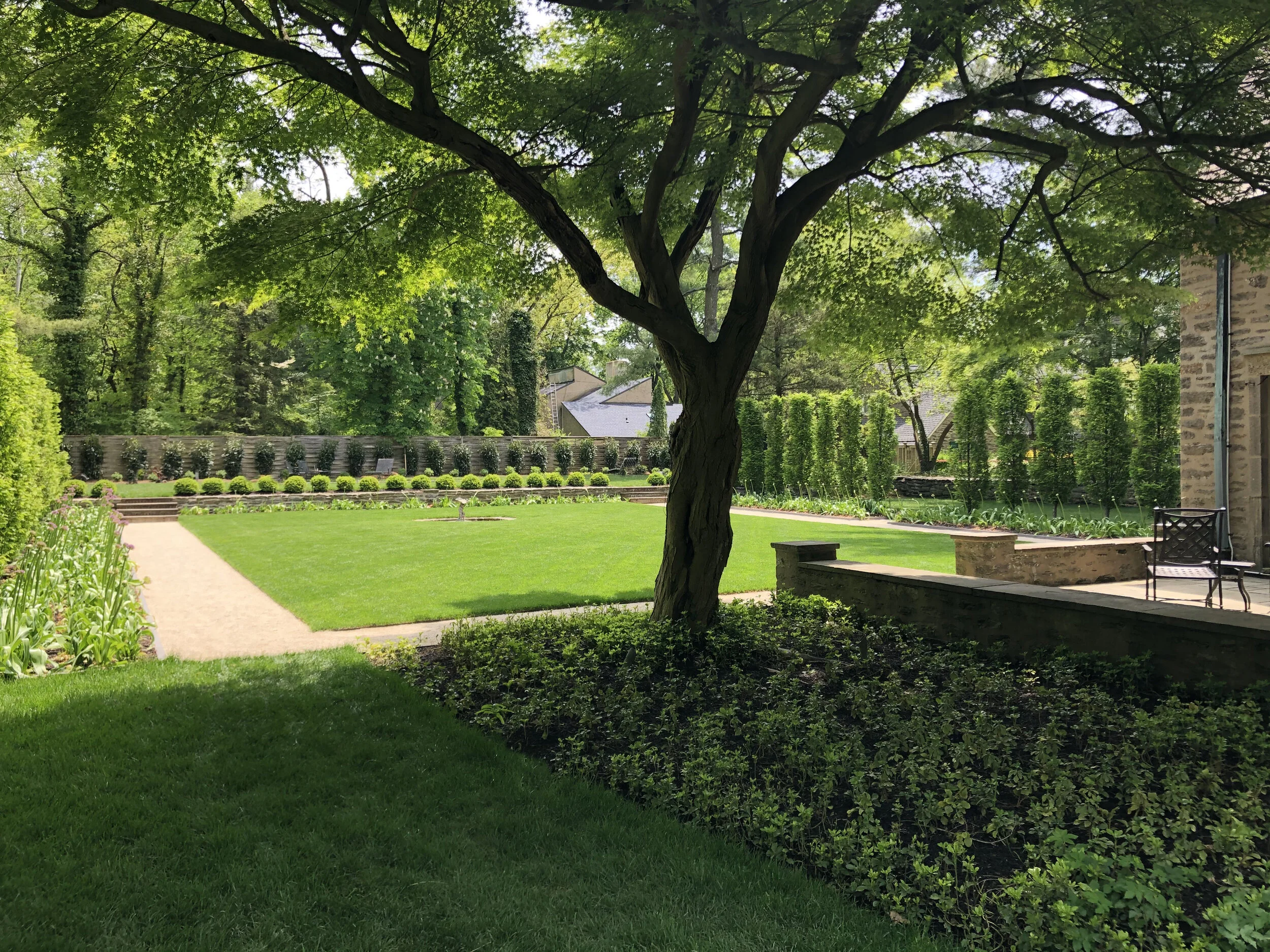 The Garden at Hedge House combines traditional french gardening techniques with modern landscape design aesthetics. The garden is based on symmetry and the principle of imposing order on nature. A central lawn panel is flanked by paths of stone fines and clipped hedges of Hornbeam, focusing the view to the Pool Terrace and the Woodland Garden vista beyond.