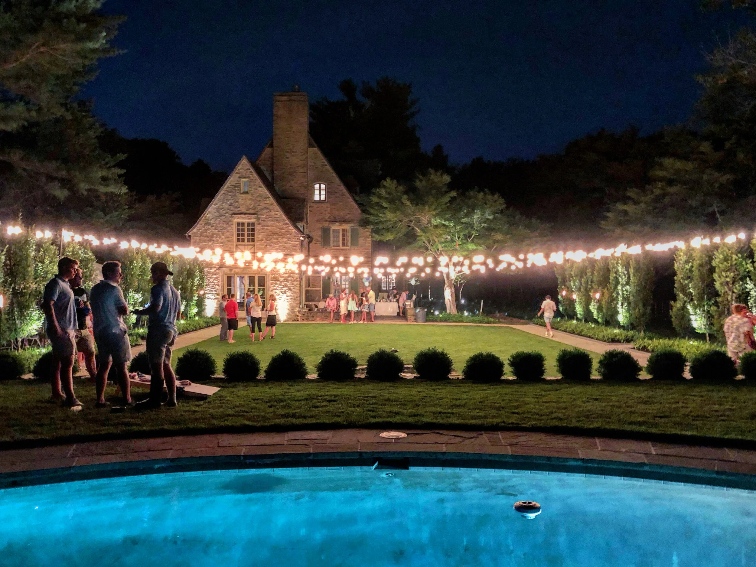 A ceiling of string lights transform the Tapis Vert into an ephemeral outdoor room for a festive occasion