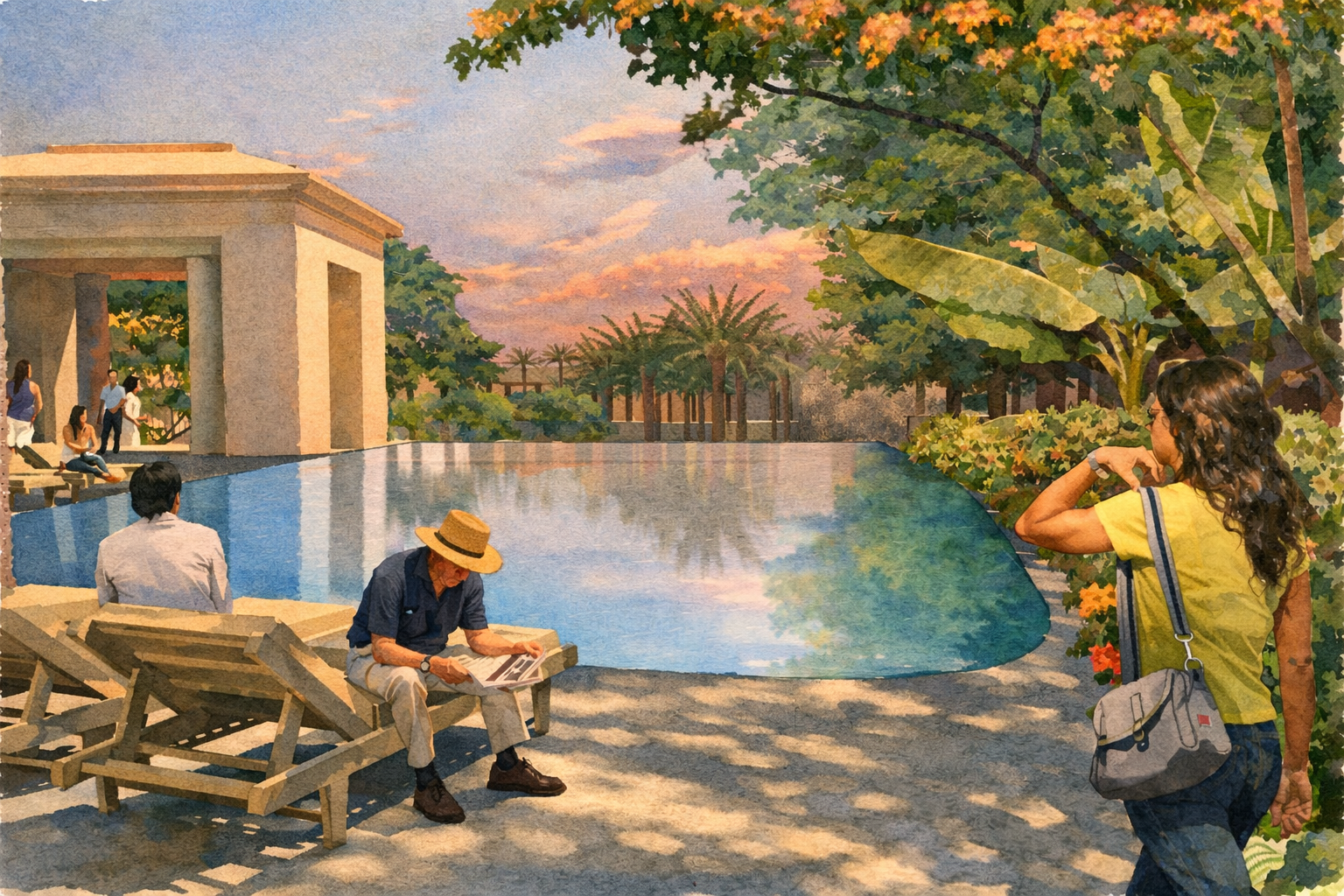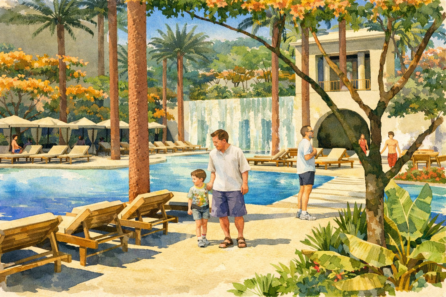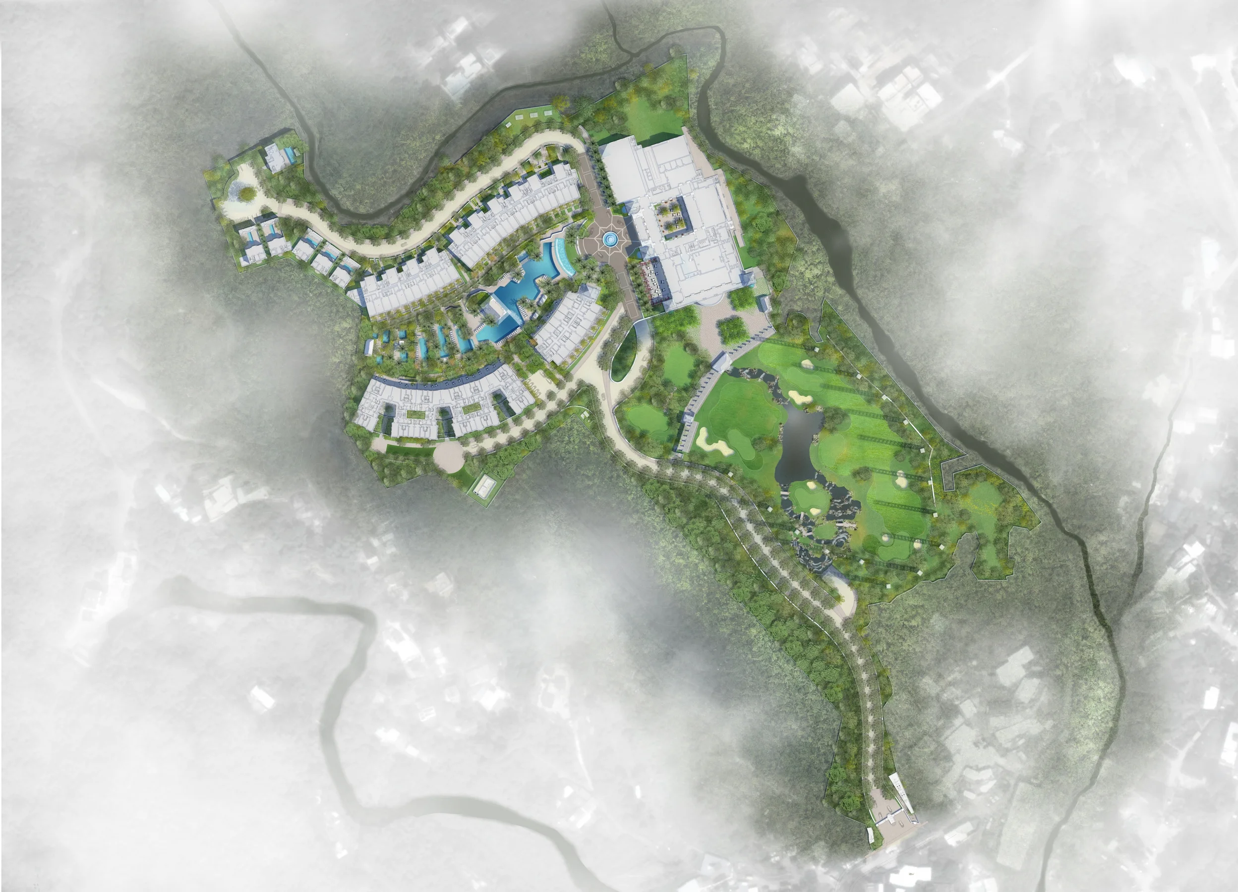 Hong Kong Golf and Tennis Academy is a 20 Acre resort in the Pak Kong area of Hong Kong. The project transforms former industrial land into a lush mountain escape. The project is a collaboration between Robert AM Stern Architects and OLIN. The site design integrates the project into the 60m of grade change across the site - creating a cascading landscape that provides a variety a different outdoor spaces. The design is a balance between flexible gathering areas c and intimate areas. The project utilizes locally quarried stone and a rich planting palette of native trees and vegetation. The open space sequence is focused around a linear water element that emulates the adjacent mountain stream. Water features appear and disappear creating a sense mystery and discovery, imbuing a sense of Landscape Imagination. Will collaborated closely with RAMSA to fully integrate the buildings into the landscape and to create a living architecture. A 6-hole golf course and driving range, design by Jack Nicklaus, is also incorporated into the project. All stormwater is carefully managed and linked to a series of underground cisterns for reuse as irrigation.