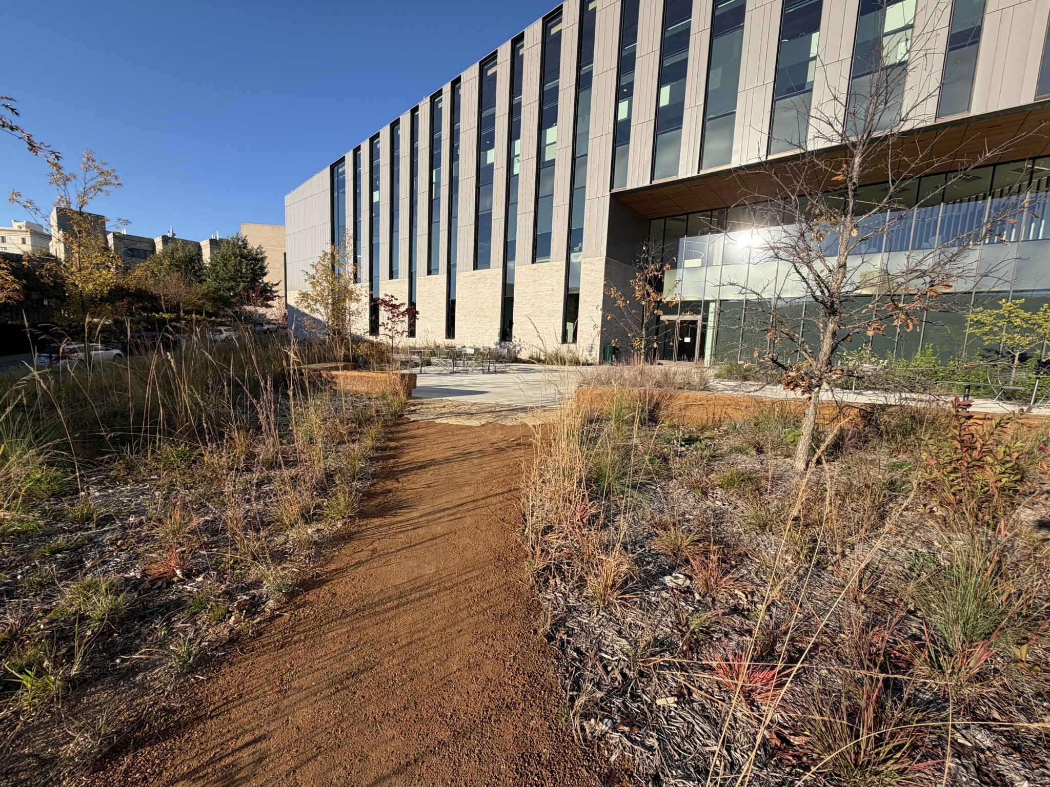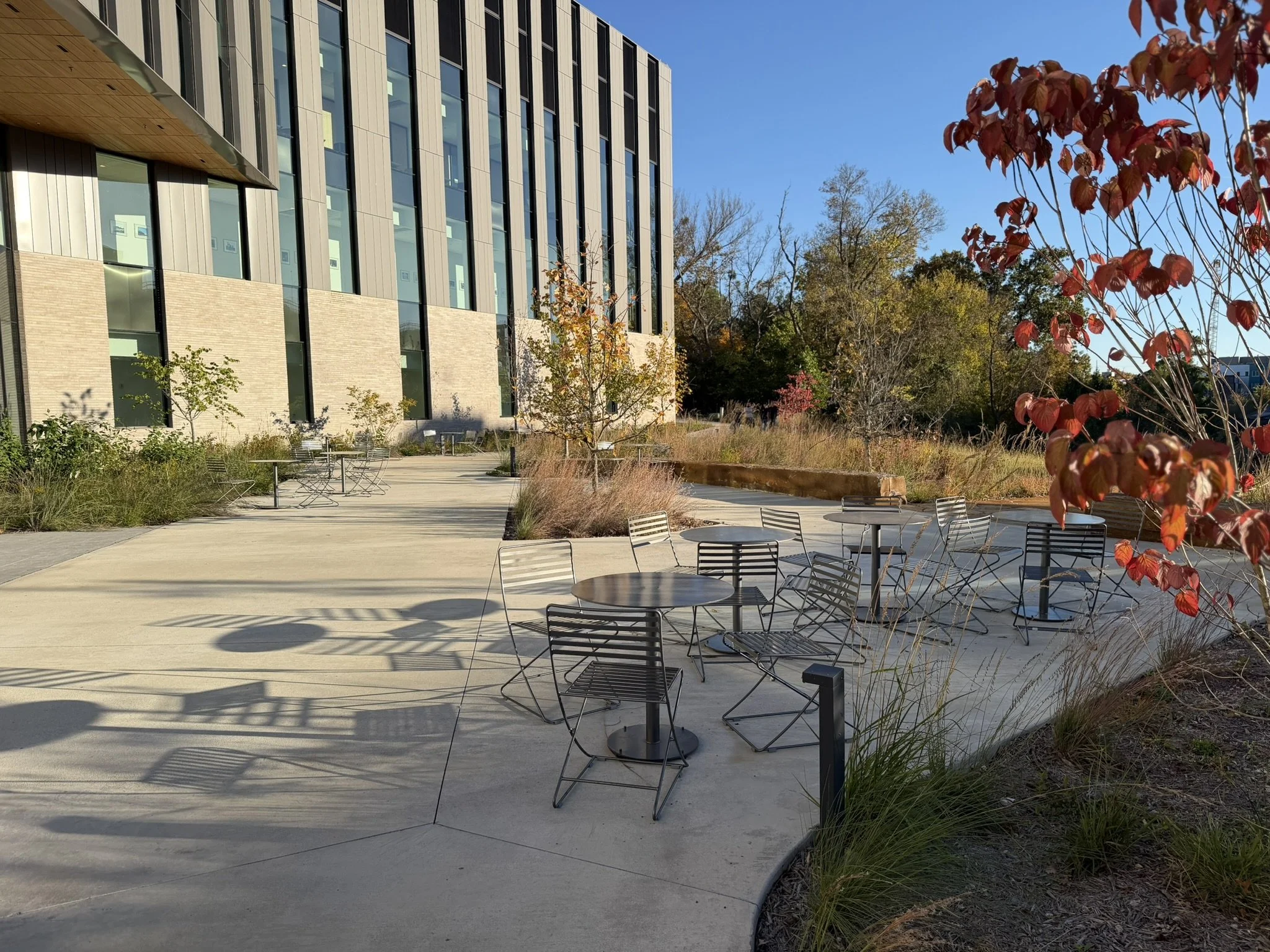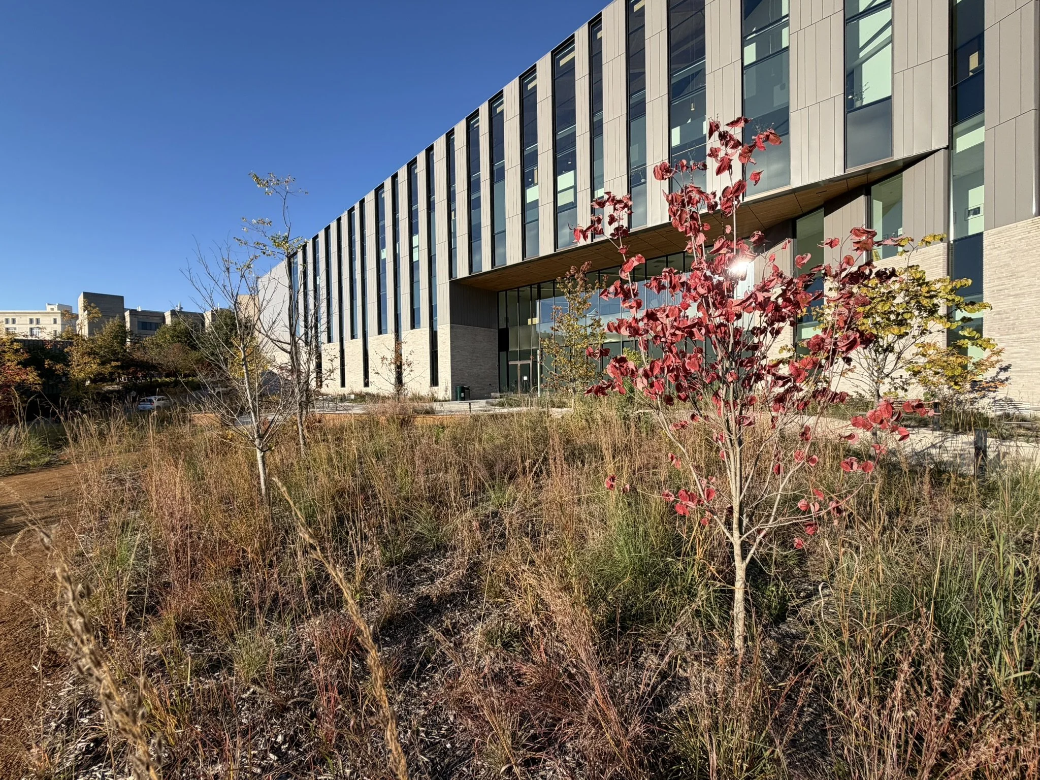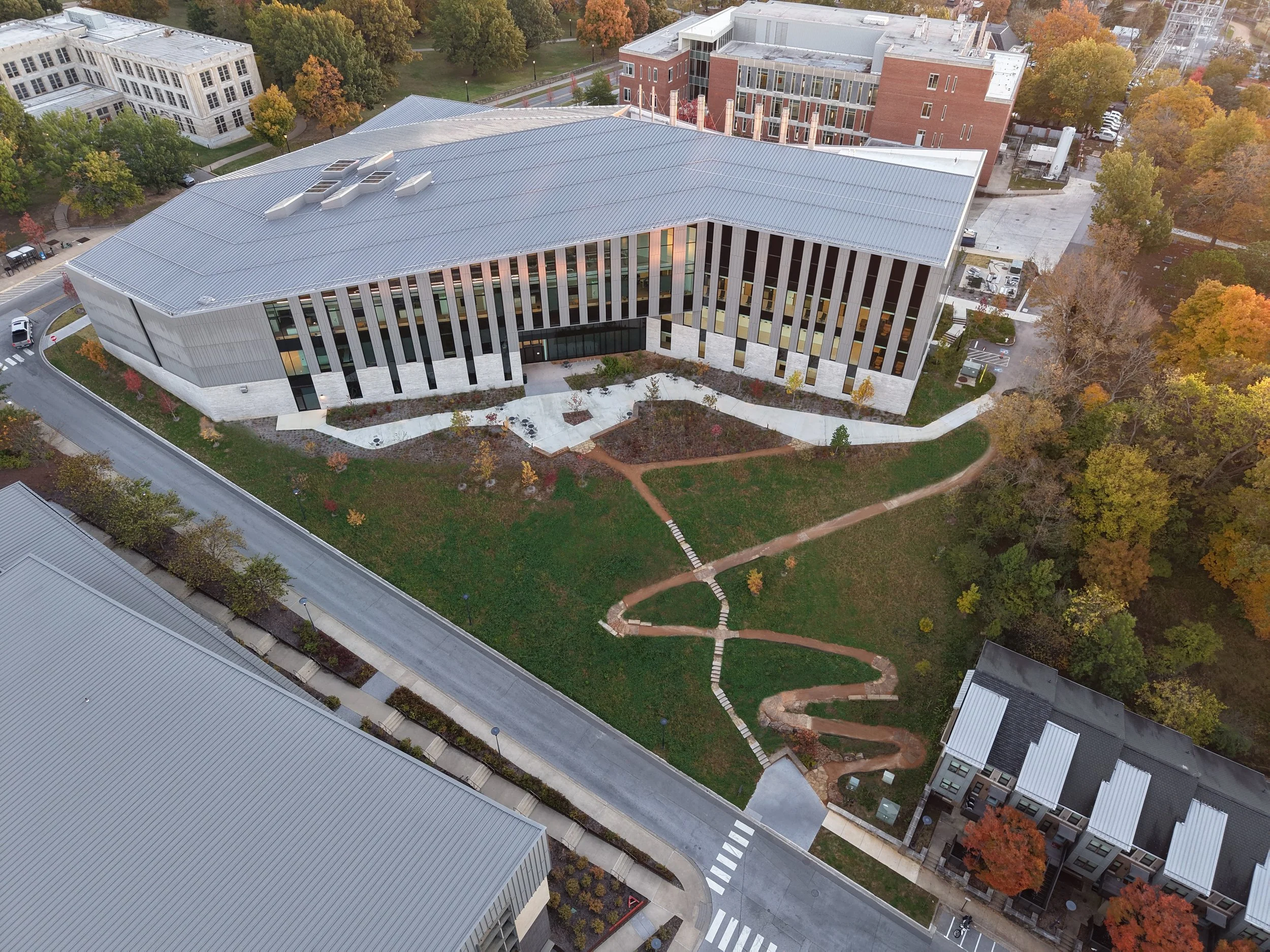 The landscape design surrounding the I3R complex provides a welcoming landscape setting, integrating the new facilities in to the existing campus and cherished oak ridge environment. The site design stabilizes the extreme slopes of the Oak Ridge with the introduction of a Oak Savanna landscape, Outdoor terraces and porches frame views, foster a sense of community and increase opportunities for engagement between faculty and students.