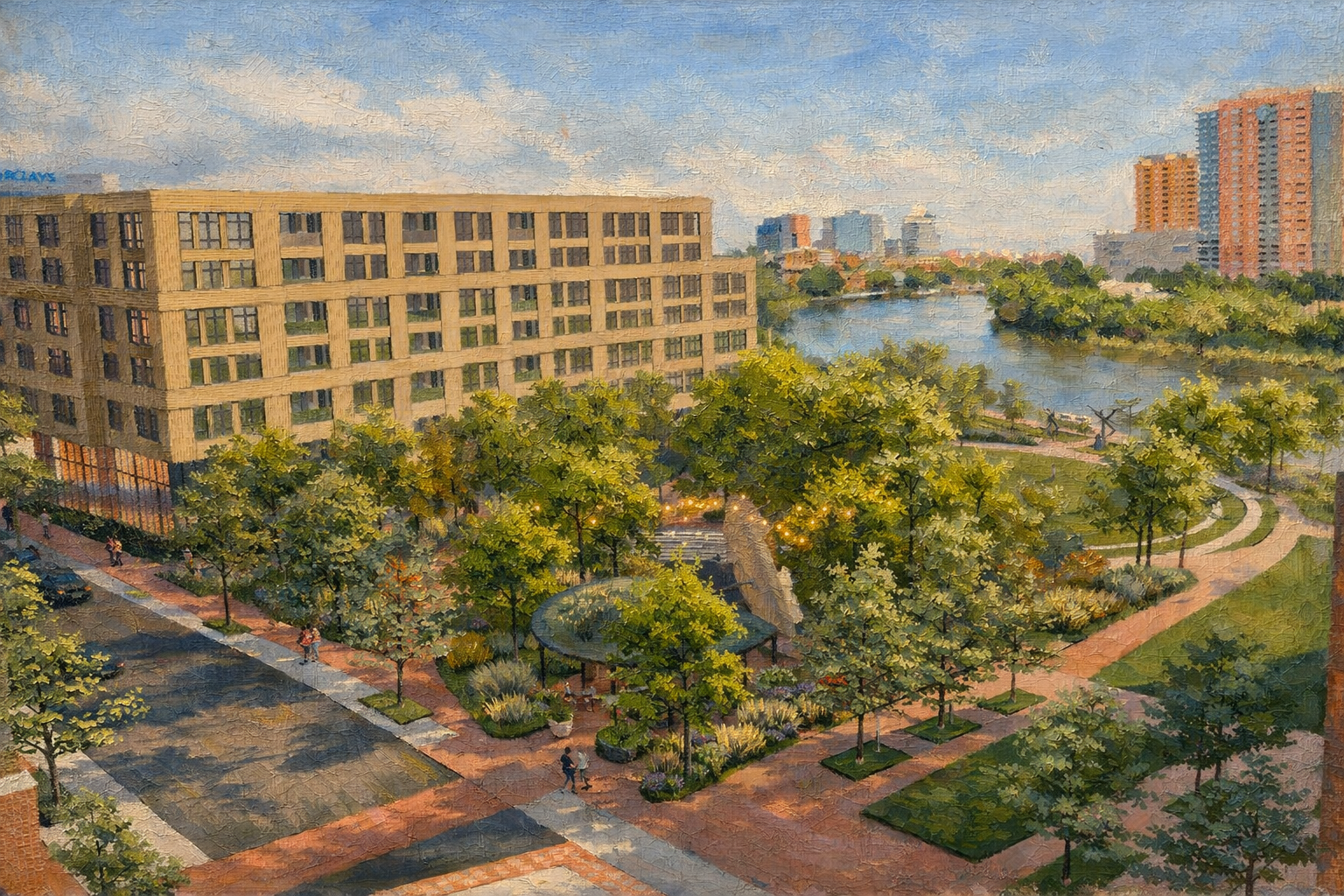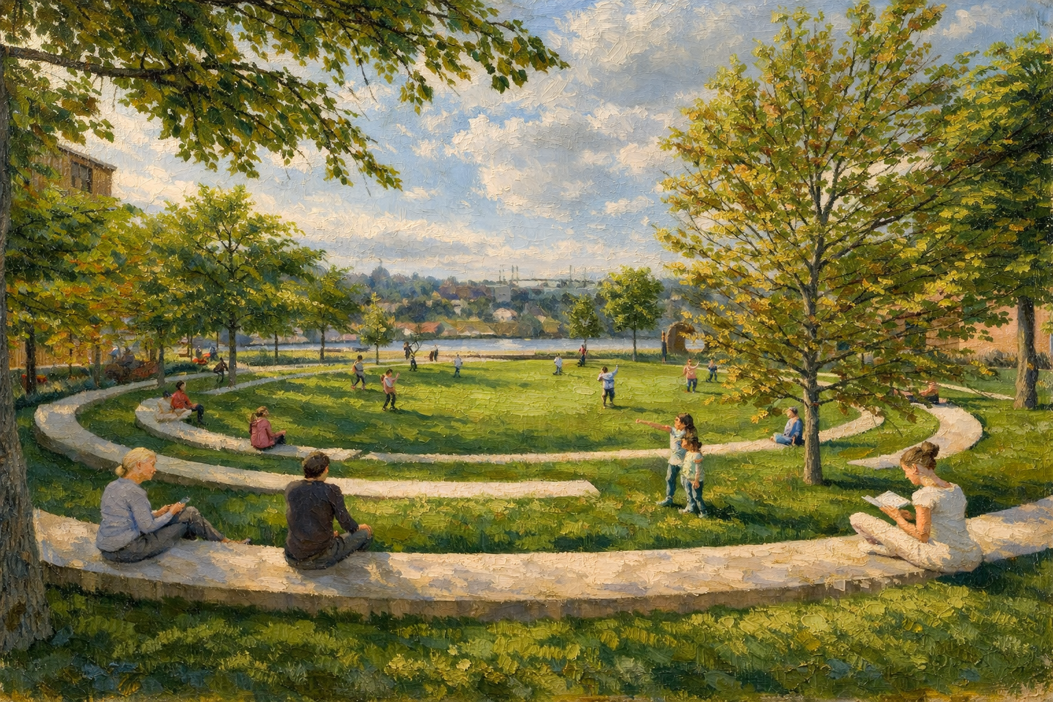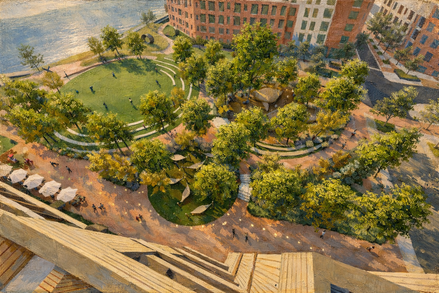 Curving brick pedestrian paths extend the Justison Street streetscape toward the Jack Markell Trail, guiding visitors across gently rising ground to a central overlook approximately six feet above the riverfront. From this elevated vantage point, views open across the Lagoon and the River Lawn, flexible green spaces designed to accommodate informal gatherings, seasonal programming, and everyday recreation.