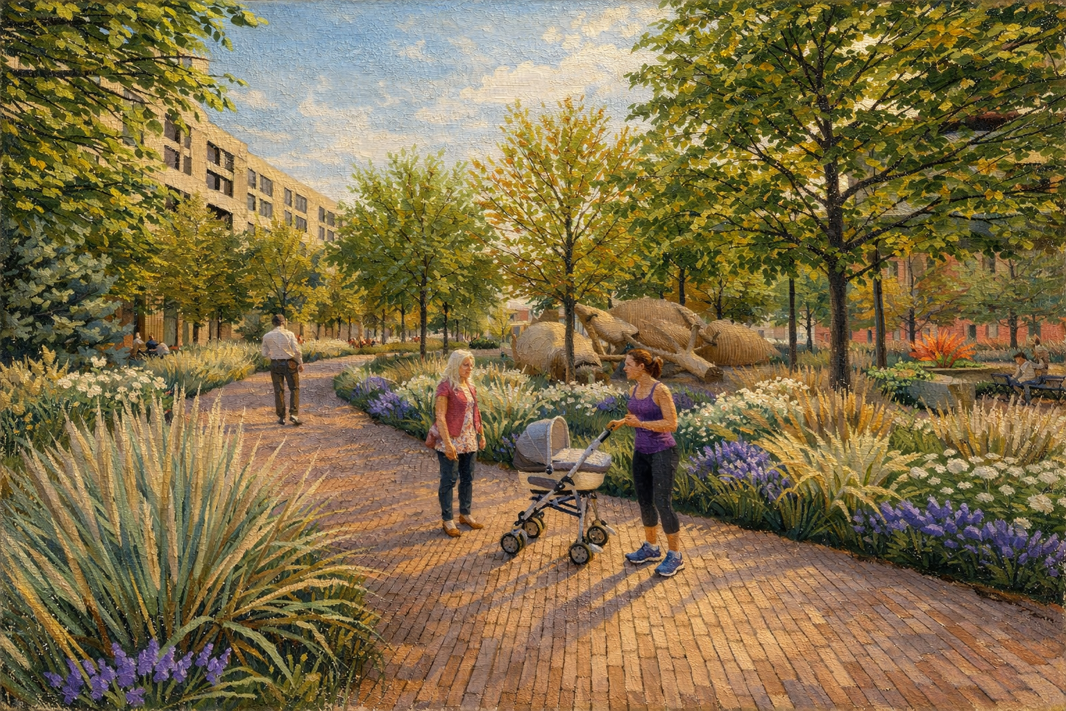 From the Overlook, the Riparian Ramble descends toward the Christina River through a gradient of native plant communities that reflect the region’s upland-to-tidal transition. Stabilized stone fine paths wind through pollinator meadows and native grasses, immersing visitors in the textures and seasonal rhythms of the Fall Line ecology. Reclaimed stone benches offer moments of pause along the way.