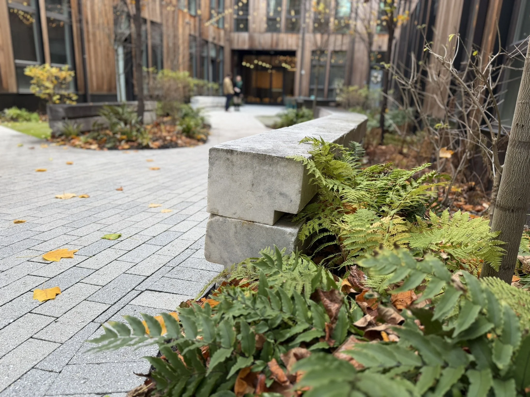The spatial structure of the courtyard is defined by a cathedral of fastigiate trees, whose upright habit reinforces a sense of enclosure without heaviness. Their verticality echoes the surrounding architecture, creating green columns that soften the block’s hard edges while maintaining clarity and order. The trees frame views, modulate light, and lend the courtyard a composed, almost civic calm, a modern cloister set within the city.