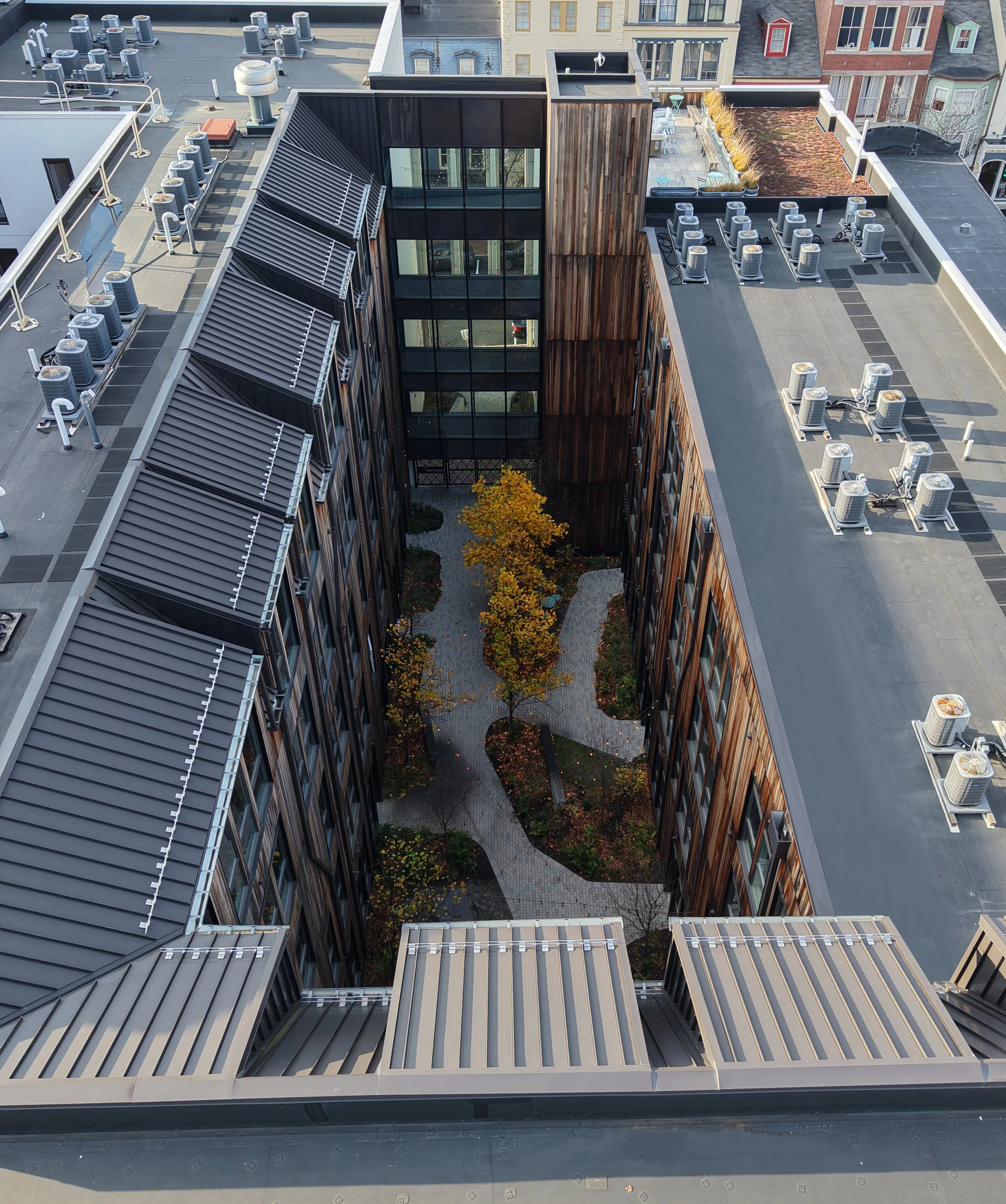 Together, these elements create a courtyard that is neither decorative nor incidental. It is a space defined by reuse, restraint, and intention, where historic materials, precise planting, and generous communal elements foster a sense of shared ownership. In a downtown context, the courtyard at The Cooper becomes a quiet act of urban generosity, offering residents a place to gather, reflect, and belong.