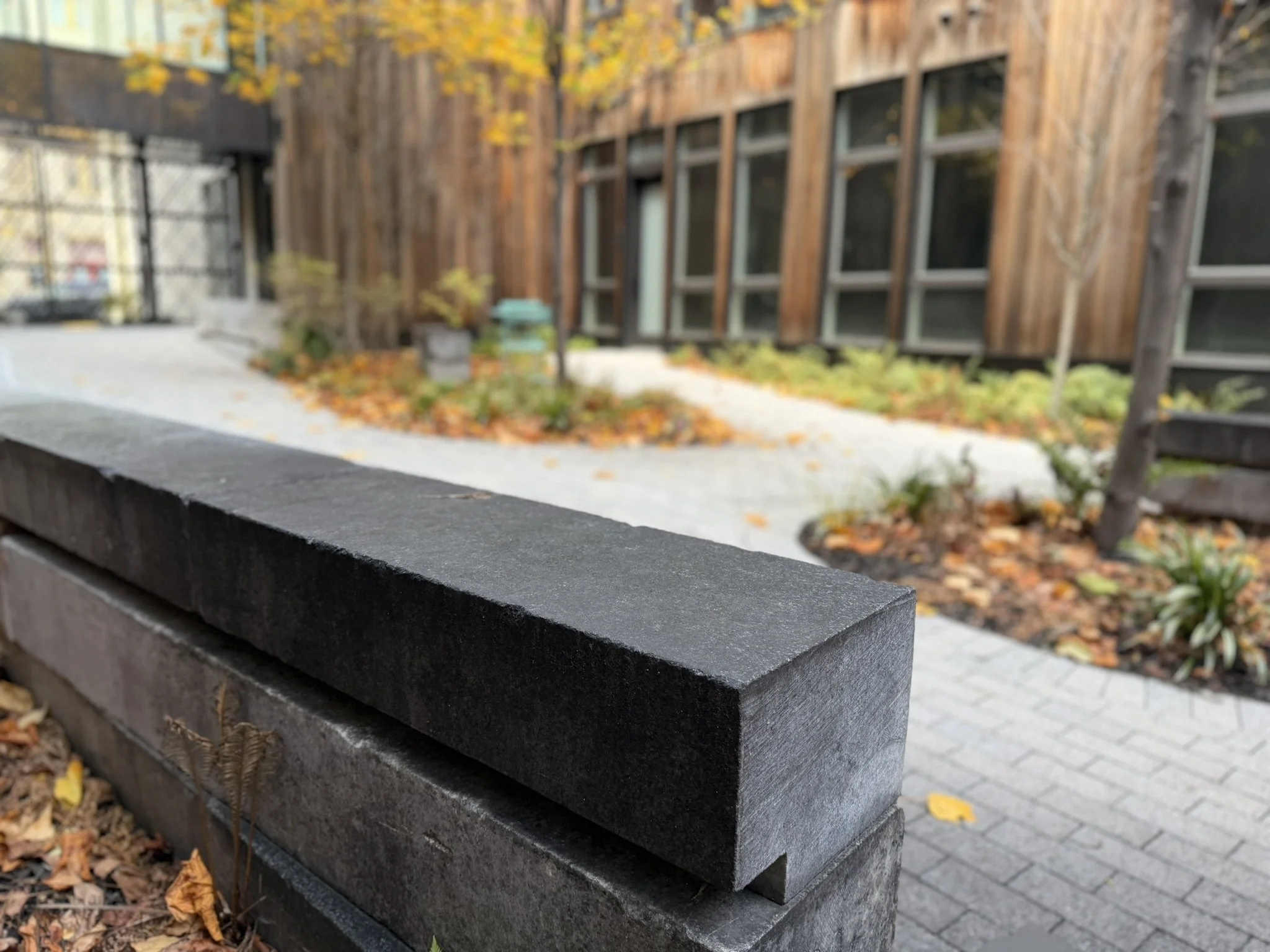 Anchoring the space is an 18-foot community table, constructed of marble and precast charcoal concrete. Substantial and unapologetically heavy, the table acts as the social fulcrum of the courtyard. Its length invites shared meals, chance encounters, and collective rituals, while its materiality echoes the benches and surrounding architecture. This is furniture as infrastructure: durable, timeless, and built to host years of everyday use.