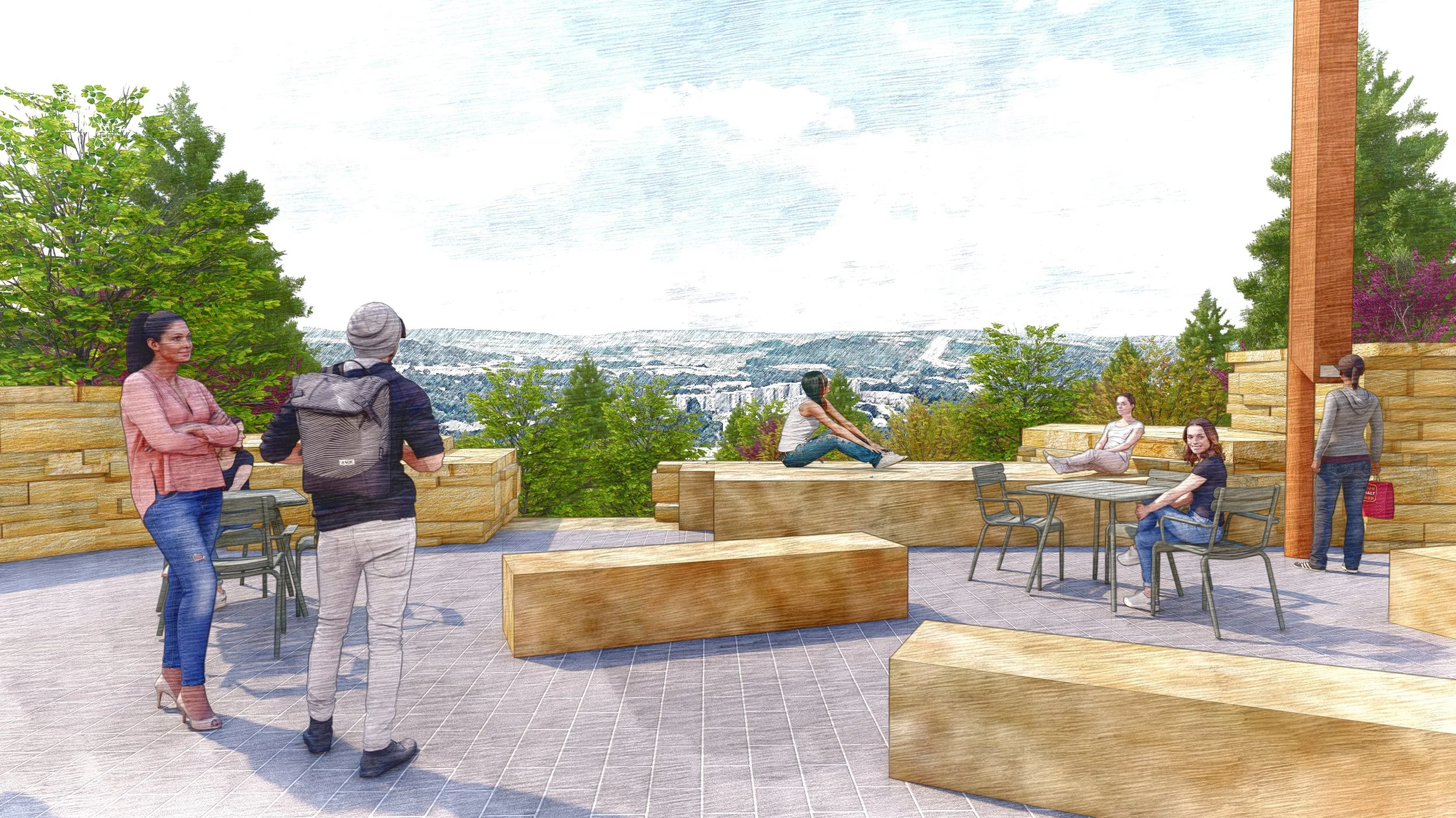In 2021, Ground Control was invited to develop the Walton College of Business Landscape Master Plan. The plan integrates disparate landscape spaces within the College Quad and focuses on improving the physical and mental health of faculty and students. The plan proposes activating the Oak Ridge, a unique natural area south of the quad with recreational opportunities and areas for outdoor classrooms and studies, as well as opening up view corridors to the expansive views of the Fayetteville hills beyond, reinforcing the College’s connection to the region. The plan also proposes pedestrianizing Fairview Street and service drive to the Walton Quad. The plan providing trailhead access to the Oak Ridge while activating the existing quad with outdoor areas for study and gathering, including several pavilions to provide much needed shade.